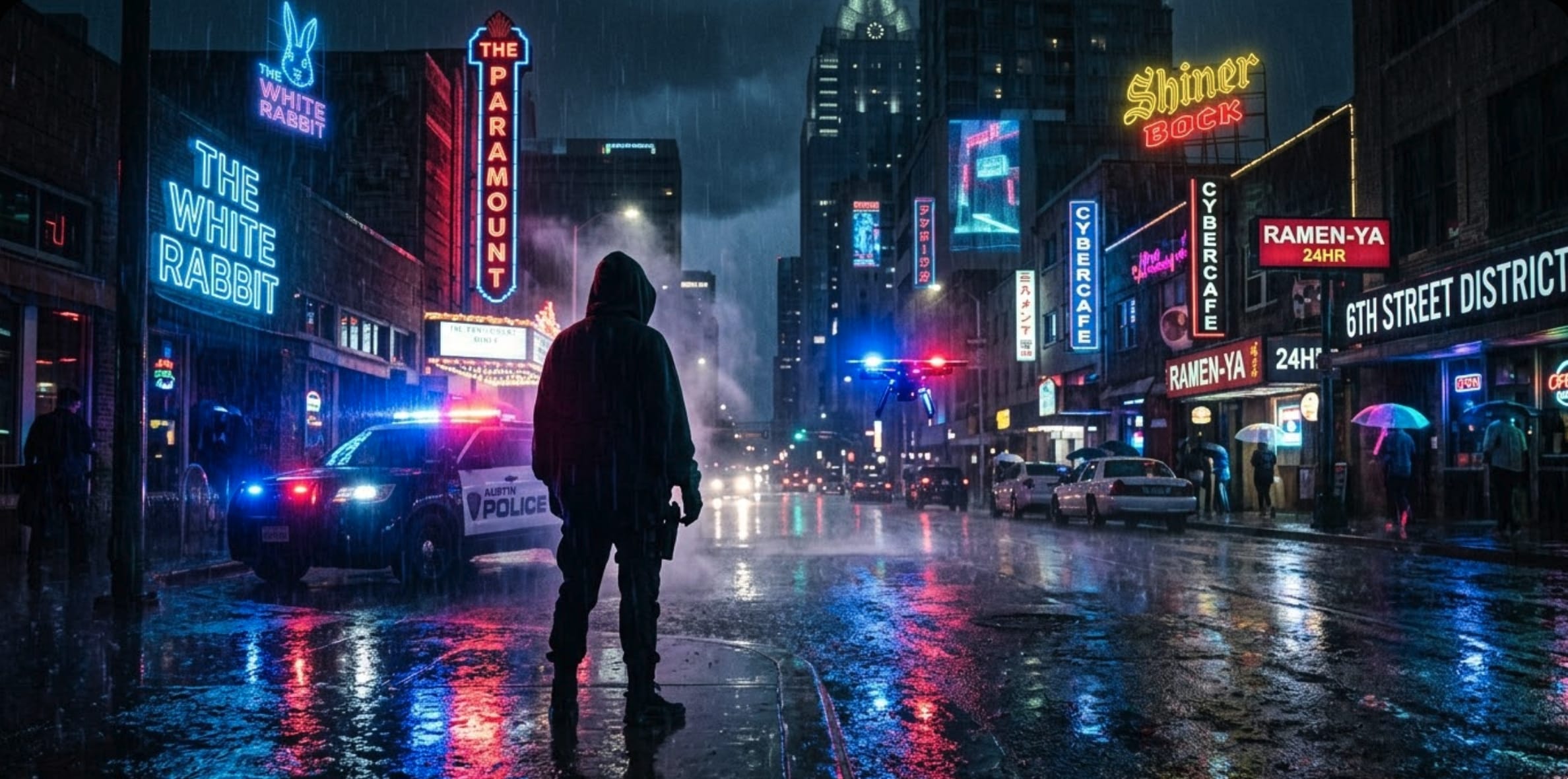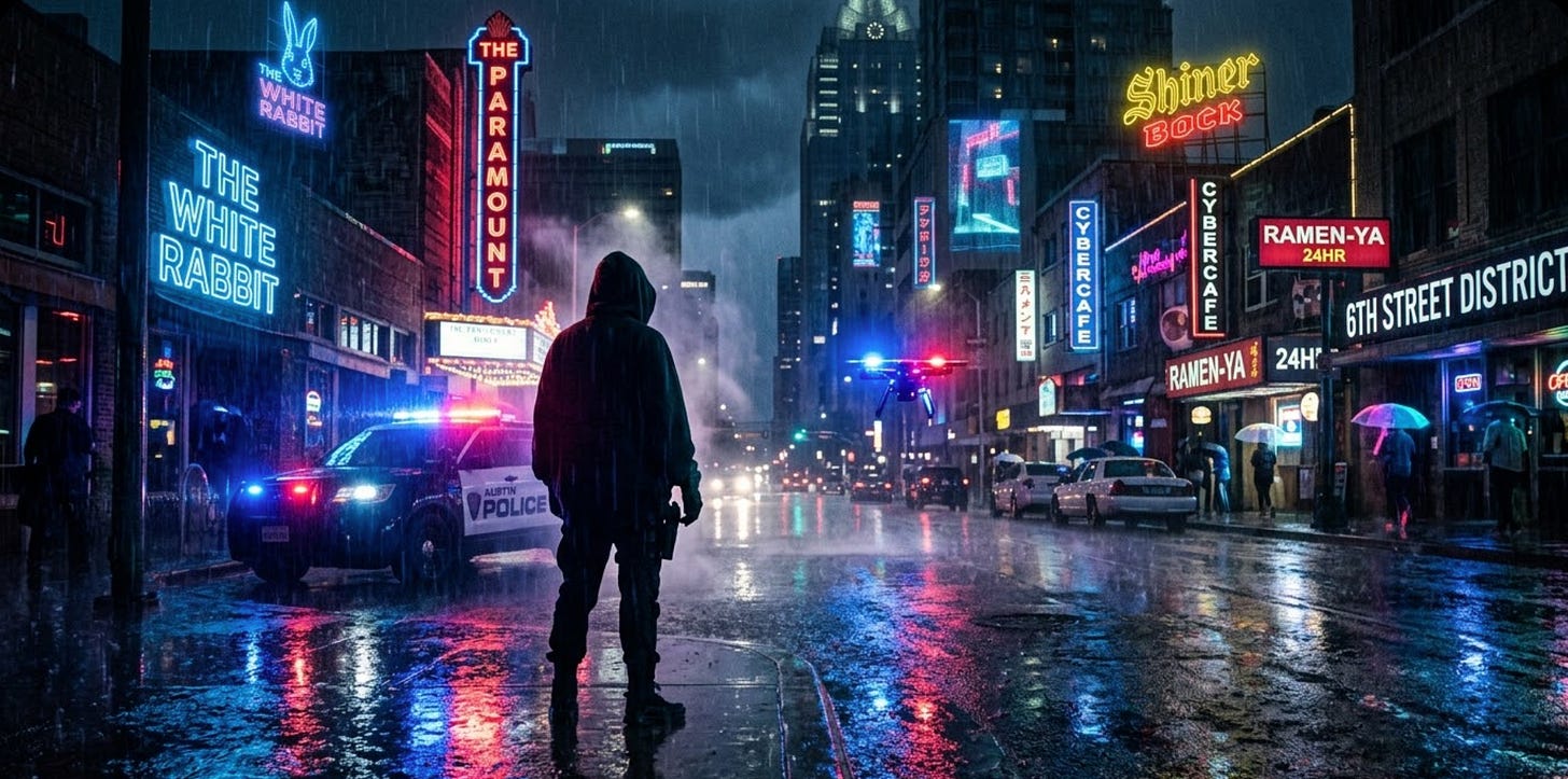 The morning after the opening sorties, a gunman in a “Property of Allah” hoodie opened fire on Austin’s Sixth Street. Three dead. Fourteen wounded. The FBI calls it a “possible” act of terror, still “working the case.”